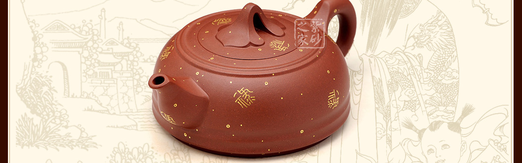 镶金装饰紫砂壶是近些年来在紫砂壶身上运用的较得广泛的一种装饰手法,又叫镶金工艺,这种工艺是运用雕、镂、塑、嵌、刻等多种工艺技法组合而成,运用此种方法,首先要在坯体上刻出所要装饰的图文小槽,将壶烧成后,把加工好的金丝放入槽内,轻击敲实后磨平即成,使紫砂壶体上呈现出黄金线条构成的各种图文画面。用这种镶金工艺来装饰的紫砂壶华贵而高雅,不仅提升了紫砂壶的文化品位和艺术含量,而且大大提高了紫砂壶的自身价值,从而成为紫砂壶中的名贵一族。