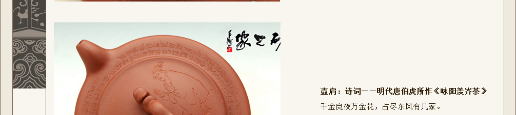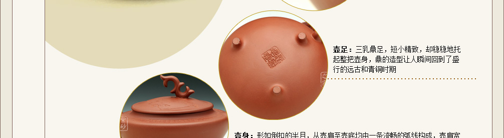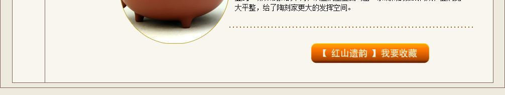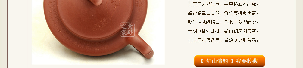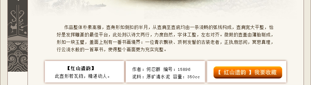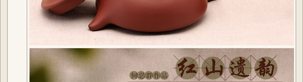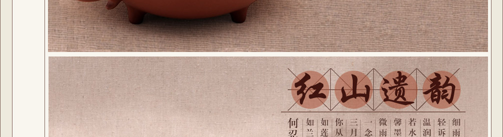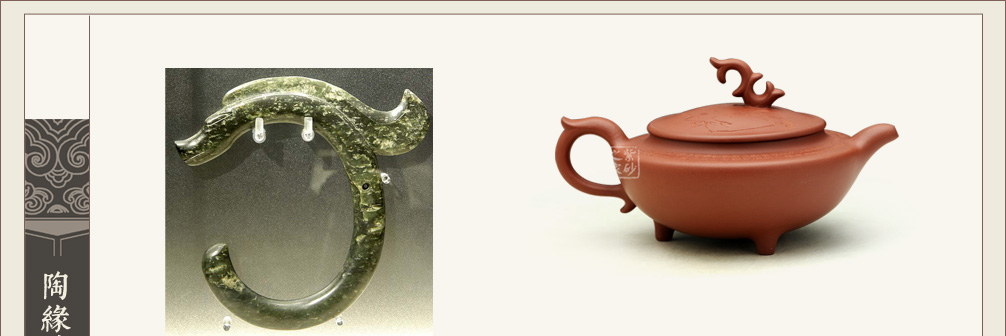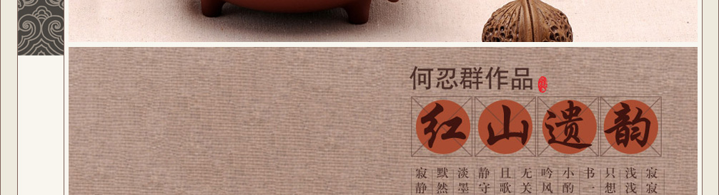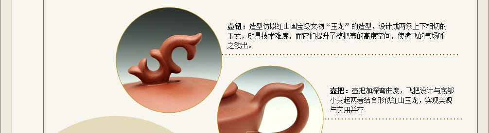 象征红山文化的中国第一“龙”—C型玉龙,演绎着龙腾盛世的景象,而《红山遗韵》便以此为中心展开设计理念,腾飞的玉龙流露出喜庆,精心雕篆的文字凝结着历史的厚重感,当这把红艳艳的、质感细滑的《红山遗韵》呈现在眼前时,不禁怀中一热,来自远古的归属与文化的领悟震撼人心。古老的紫砂陶结缘红山遗韵,演绎出一番全新的境界。