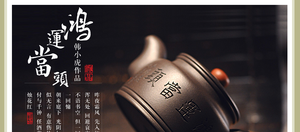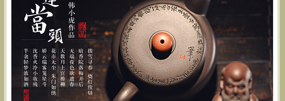 韩小虎,艺名一指,男, 1950年7月生,江苏宜兴人,中共党员。1974年开始从事均陶艺术创作,1979年进中央工艺美术学院进修,现任宜兴均陶工艺厂指艺斋精品研究所所长。韩小虎自幼受古陶文化的熏陶和影响,酷爱均陶堆花艺术。从艺后又经院校多次培训,使他不仅具有深厚的艺术功底和丰富的创作经验,而且练就了一手过硬的堆花技艺的技法;20多年来,他艺德高尚,对艺术精益求精。他在继承传统堆花工艺的基础上,积极开拓和创新,使作品充满浓厚的现代生活气息。他集堆贴、浮雕与绘画技艺于一身。凭借其大拇指的神奇动力绘制出的"高山流水、庭台楼阁"端庄秀丽,楚楚动人。其"鱼虫花草、珍禽猛兽"形象逼真,栩栩如生,给人以大自然的灵秀之美感。