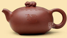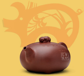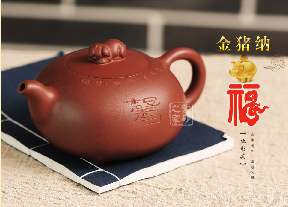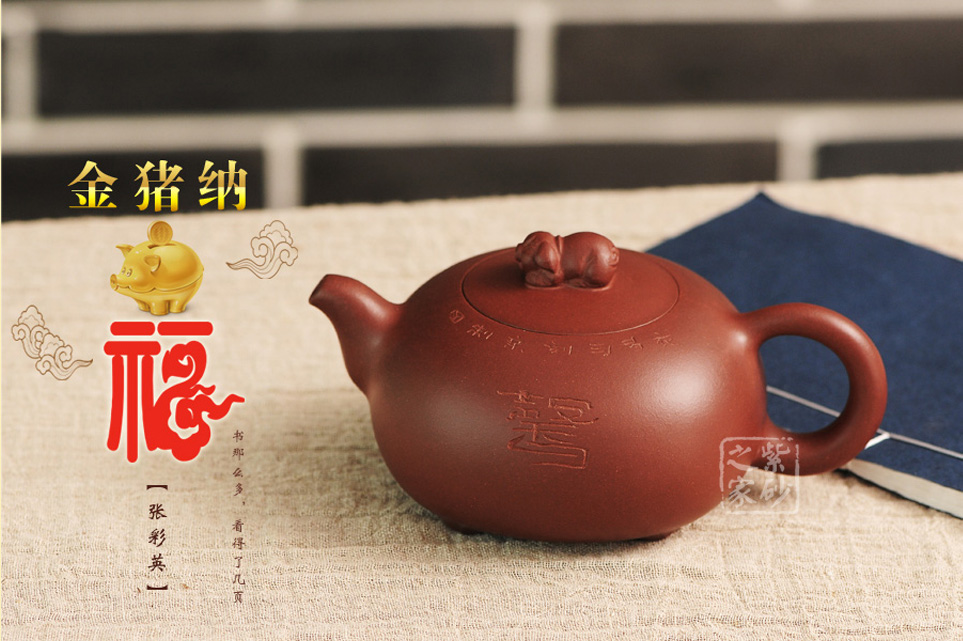 砂与壶结缘,紫砂壶便是壶中群芳之冠;紫砂壶与书画家结缘,便更添独特的艺术气息。伴随紫砂壶收藏热,紫砂刻绘随之步入新天地,诸多篆刻家以刀代笔,以紫砂壶为载体进行艺术创作,并在圈子里形成热潮。张彩英老师《金猪纳福》系列便用书画艺术渲染了整个作品。