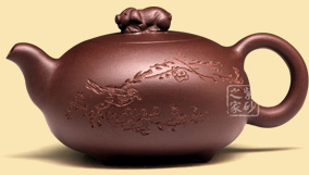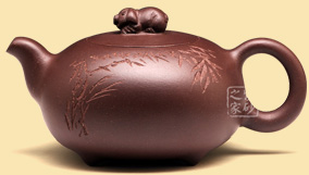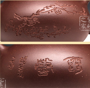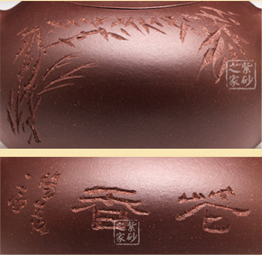 竹风轻徐,“花香”满庭,看似没有多少关联的刻绘内容,却是在向我们营造出一种宁静温馨的品茶环境,自是一种悠然惬意!
