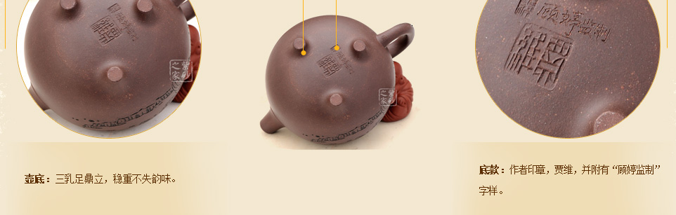 其作品的装饰皆为顾绍培亲笔题写在壶身上,然后精雕而成,其作品皆由师傅顾婷亲自监制,且落款处皆印有"顾婷监制"字样。贾维的作品皆为全手工制作,足见其制壶功底之深厚,天赋以及造诣都是极高的。