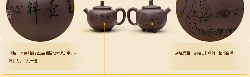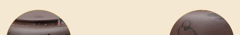壶身正面篆刻的是"玉壶禅心",亦可作"一片禅心在玉壶",取茶禅一味的寓意;壶身反面篆刻的是"品茗图",一居士坐于一块青石之上,皓月当空,疏影清瘦,茶韵清香,身形慵懒自在,一壶一杯,自斟自酌,画面简单空旷,气韵别具一格。